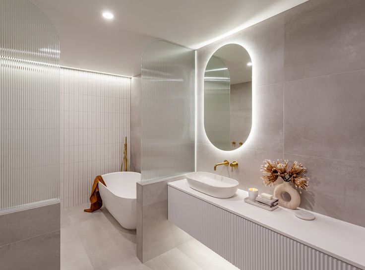 Curved edge fixed panels all fall into the trend of bathroom curves.