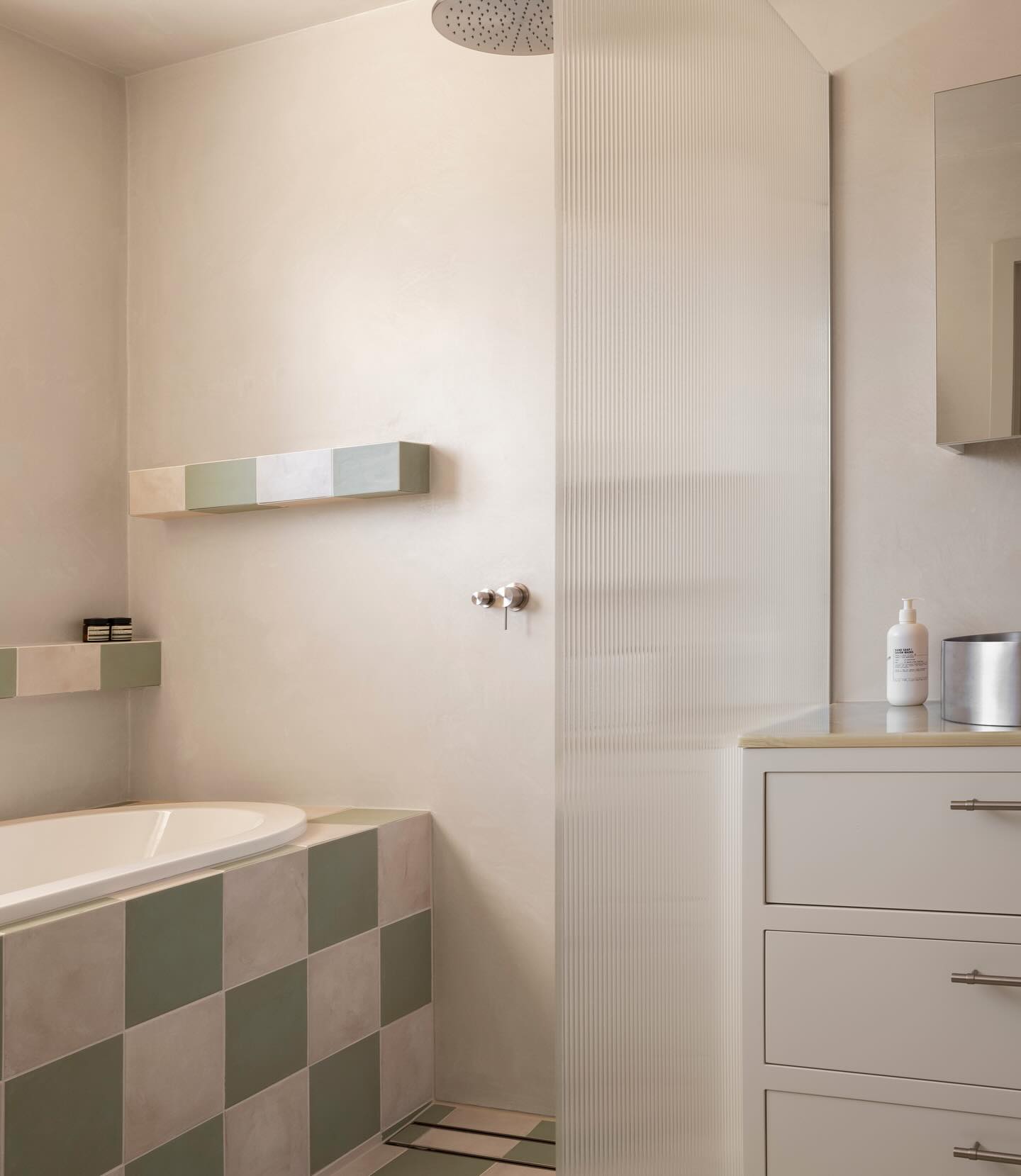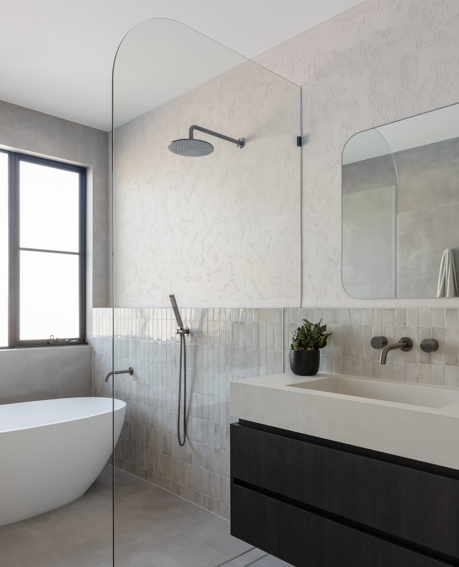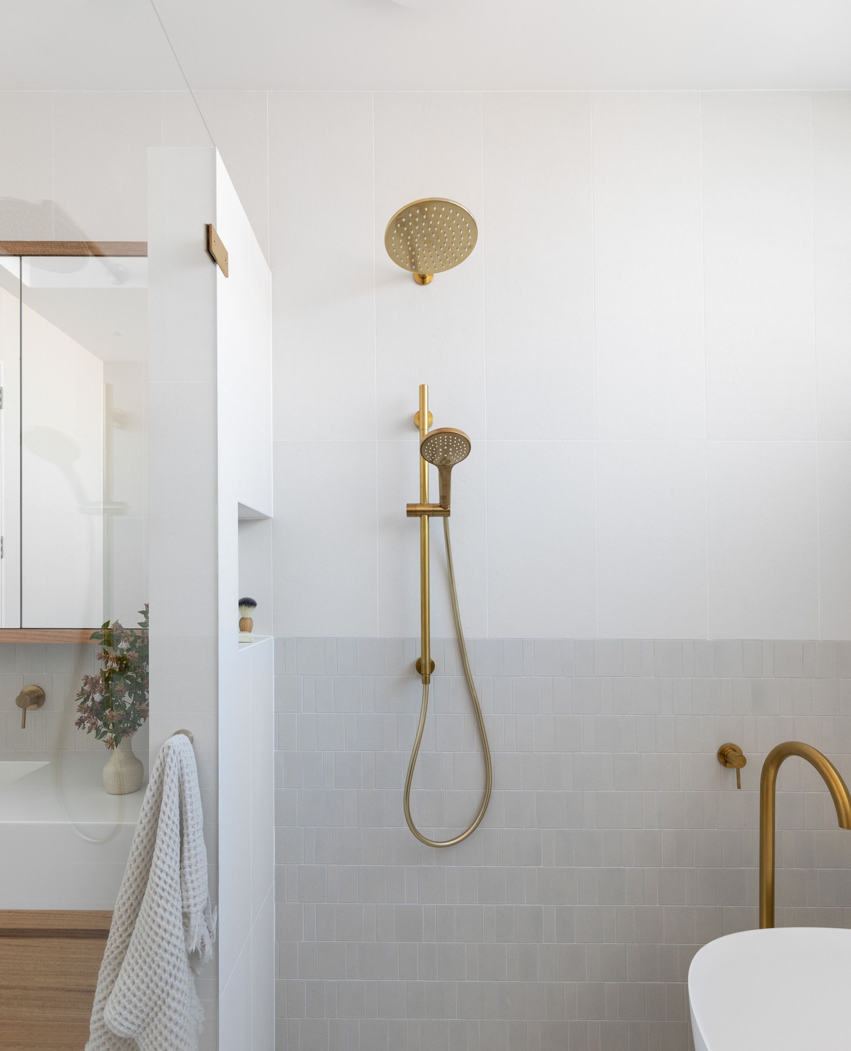 Minimalist with a touch of individuality which means yes to eye-level storage and no to bricked-in baths.