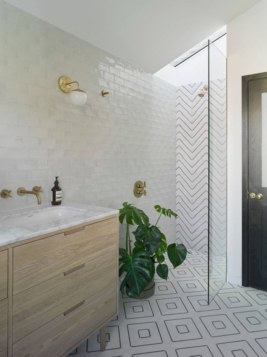 The aim is that when you want to enter the bathroom, everything can be seen, but you won’t have to scoot around a vanity or bulky screen when you walk in.